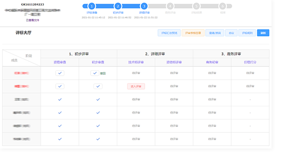 针对投标人逐个进行评审,单个保存结果,全部评审完成后进入下一阶段。
