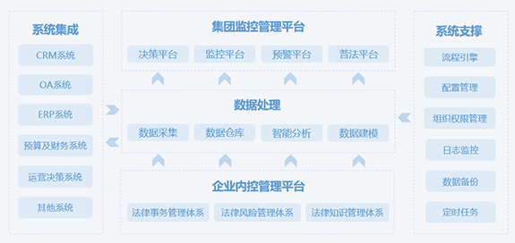 建立规范、标准的法律事务体系、法律风险体系、法律知识体系,三层体系相互融合,实现集团总部及各级企业内控管理。