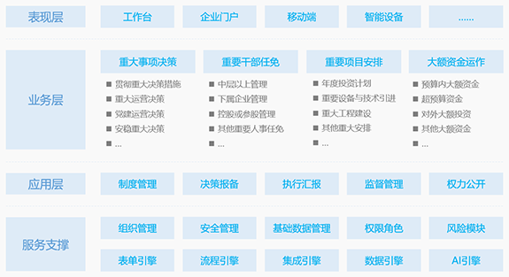 包括“三重一大”事项管理、决策支持、监察汇报。通过对流程管控、多级监控、信息打通和自动监管,来实现“三重一大”制度的落地,以及一些常见问题的解决,是央企、国企三重一大决策的有力支撑。
