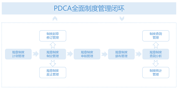 遵循“PDCA”全面质量管理管理理念,对规章制度全生命周期各环节管理,实现数据共享、信息存储、文件审批等功能,持续改进制度的质量。